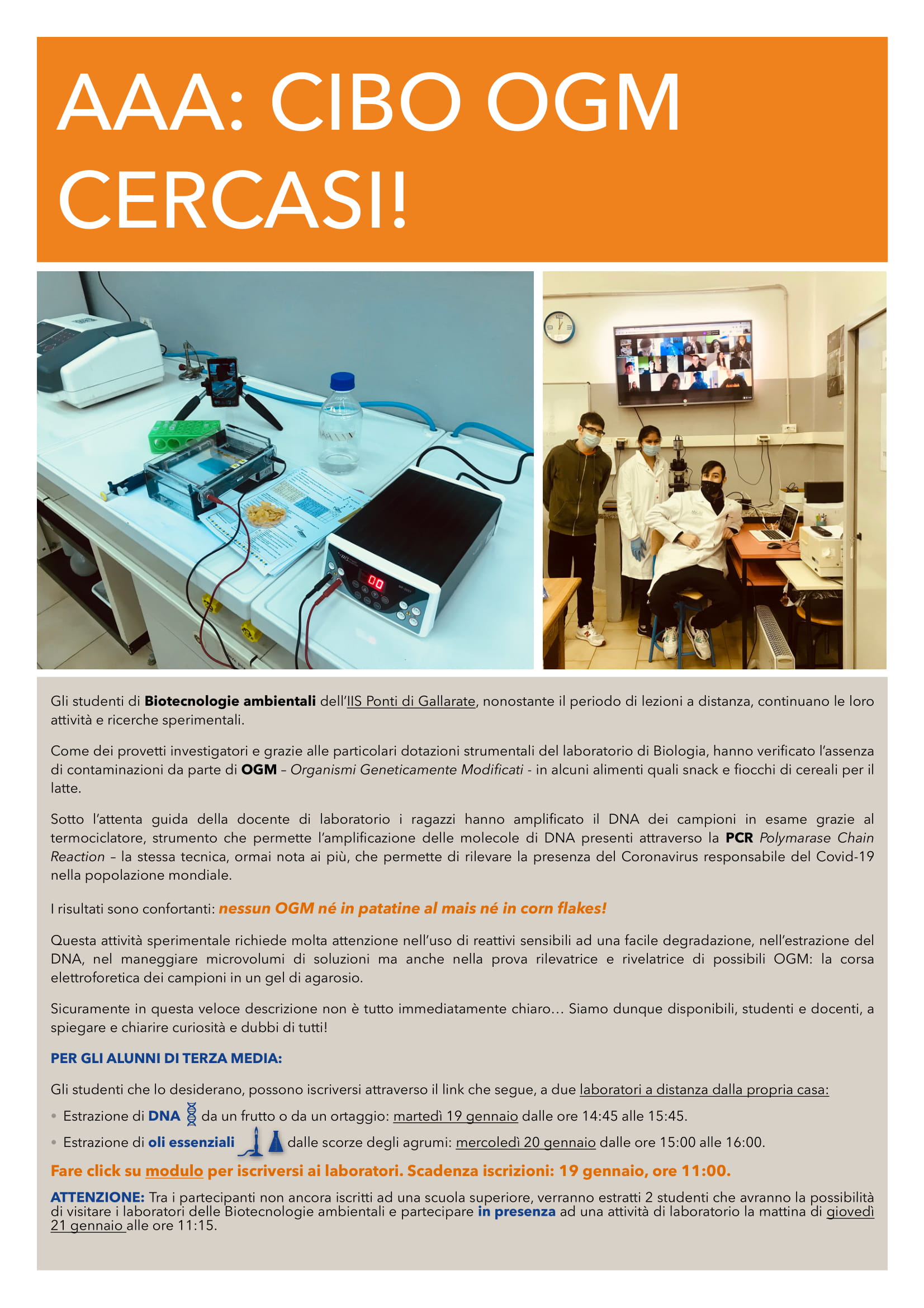 I docenti del corso di Biotecnologie ambientali dell’IIS “Ponti” di Gallarate hanno invitato gli alunni di terza media a partecipare ad un evento online durante il quale verranno raccontate alcune attività sperimentali che si svolgono nel corso di studi, tra cui anche quelle che sfruttano la reazione della PCR, la stessa tecnica utilizzata per la rilevazione della presenza del Coronavirus, responsabile del Covid-19.
