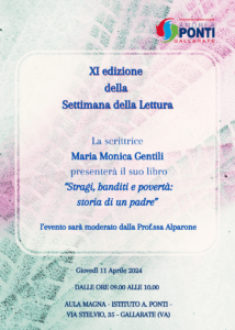 In occasione della XI Edizione della ‘Settimana della Lettura‘, il giorno 11 Aprile, presso la sede di Via Stelvio, si terrà l’incontro con la scrittrice Maria Monica Gentili che presenta il suo romanzo storico ‘Stragi, banditi, povertà. Storia di un padre’, Edizioni Artestampa, 2023. Modererà l’evento la Professoressa Alparone.