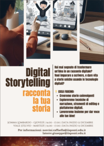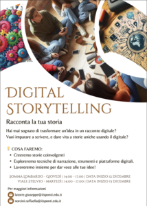 Siamo lieti di annunciare l’avvio del corso di Digital Storytelling, un percorso formativo innovativo che mira a sviluppare le competenze narrative e tecnologiche degli studenti. Attraverso l’uso di strumenti digitali, i partecipanti impareranno a progettare e raccontare storie coinvolgenti, combinando testo, immagini, video e audio per creare contenuti originali e interattivi. Il corso si propone di potenziare la creatività, le abilità comunicative e la padronanza dei media digitali, promuovendo una maggiore consapevolezza dell’importanza della narrazione nel mondo contemporaneo. Rivolto a studenti del biennio e del triennio, il progetto favorisce un apprendimento pratico e collaborativo, con l’obiettivo di integrare le nuove tecnologie nei processi educativi.
